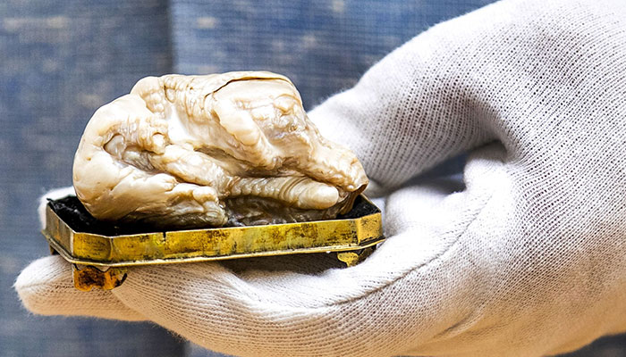 Conocida bajo el nombre de "Sleeping Lion pearl" ("Perla del León Durmiente") a causa de su forma, esta concreción nacarada de casi siete centímetros de largo y un peso de unos 120 gramos probablemente se formó durante la primera mitad del siglo XVIII en aguas chinas, quizás en el propio Río de las Perlas, cuya desembocadura se encuentra en el Mar de China Meridional.