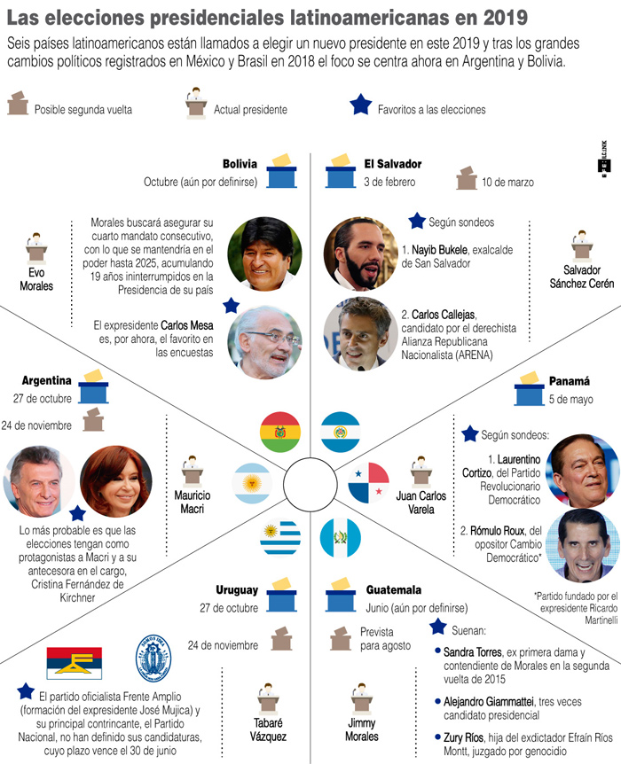 Argentina, Bolivia, El Salvador, Guatemala, Panamá y Uruguay celebran este año elecciones presidenciales que completan parte del calendario electoral de la región, que arrancó en 2018 con importantes cambios políticos de envergadura en México y Brasil.