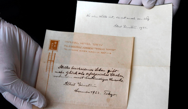 Una nota que Albert Einstein le dio a un mensajero en Tokio porque no tenía monedas para darle propina, en la que explicaba brevemente su teoría para tener una vida feliz, ha salido a luz tras 95 años y será subastada en Jerusalén.