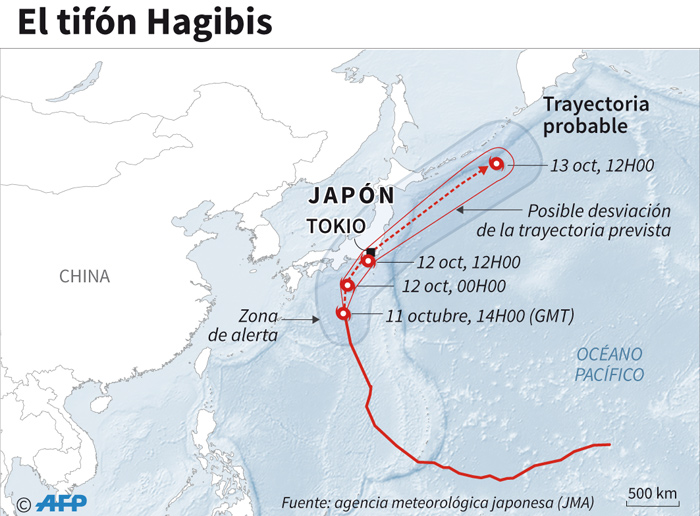 Se estima que Hagibis será el primer tifón calificado de "muy potente" que golpee la isla principal de Honshu desde 1991, cuando la JMA creó su sistema de categorías de intensidad, según medios japoneses.