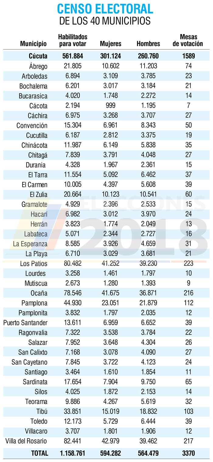 En el caso de Norte de Santander, el número de ciudadanos habilitados para votar se ubicó este año en 1’158.761, de los cuales 594.282 son mujeres y los otros 564.479 hombres.