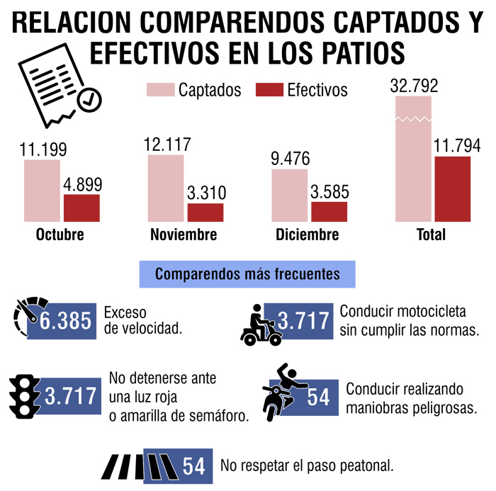 Para diciembre, la cifra subió y lo recaudado fueron 124.973.399 pesos, de un total de 763 comparendos pagados. Sin embargo, la relación entre los comparendos pagados y el número de multas puestas es muy amplia, porque solo en octubre fueron 4.899 infracciones y ese mes se pagaron solo 381, aunque no todos los comparendos pagados ese mes corresponden a los que se impusieron durante esos 31 días.