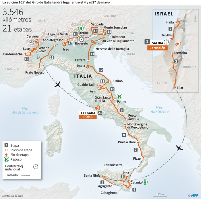 Los ciclistas viajarán entonces a Sicilia para otras 18 etapas, antes de la meta final de esta edición, programada para el 27 de mayo en Roma.