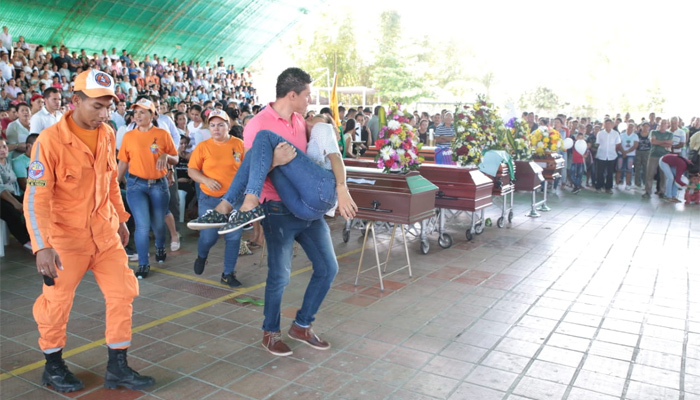 Los féretros de Fredermán Quintero, los hermanos Wilmer y Ramón Emiro Ramírez, Alexander Campo, Asdrúbal Durán y Jhon Sanabria fueron llevados primero al polideportivo Simón Bolívar, donde ante unas tres mil personas recibieron las honras fúnebres por parte de la parroquia Nuestra Señora de la Asunción.