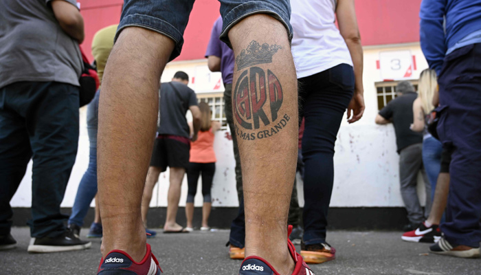 (Un aficionado, que lleva un emblema de River Plate tatuado en su pantorrilla, esperaba este miércoles en línea en la taquilla del Monumental Stadium de Buenos Aires para recoger sus boletos para el partido de fútbol.)