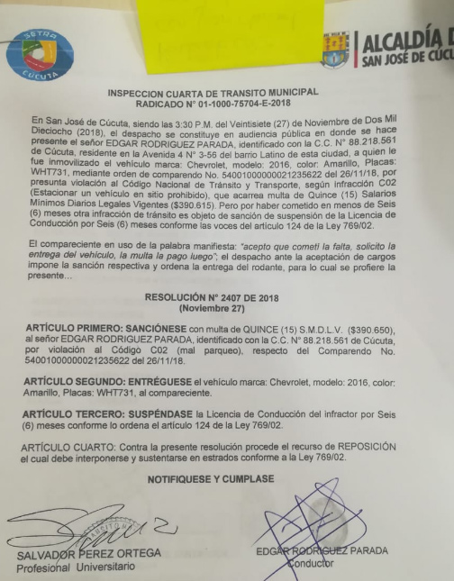 De acuerdo con lo plasmado en el documento, el sindicado reconoció la violación a las normas. “Acepto que cometí la falta, solicito la entrega del vehículo, la multa la pago luego”, dijo Rodríguez Parada, por lo que se le devolvió el carro y le suspendieron la licencia.