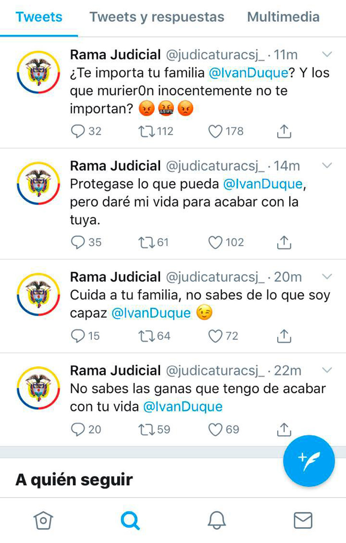 “No sabes las ganas que tengo de acabar con tu vida, Iván Duque”, “Protéjase lo que pueda, Iván Duque, pero daré mi vida para acabar con la tuya” y “Desde el Consejo Superior deseamos la muerte a nuestro querido y corrupto presidente Iván Duque”, fueron algunas de las amenazas contra la vida del mandatario que se escribieron en la cuenta de Twitter.