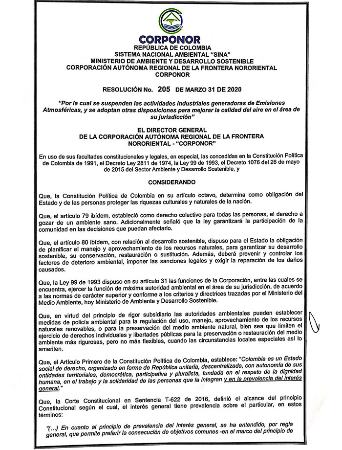 Al respecto la corporación emitió la Resolución 205 del 31 de marzo de 2020, con la que suspendió actividades industriales generadoras de emisiones atmosféricas y adoptó otras disposiciones para mejorar la calidad del aire.