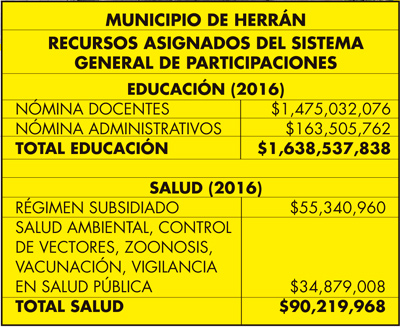 En 2017, en el municipio de Herrán, el Programa de Alimentación Escolar atiende a 376 niños, niñas y adolescentes matriculados oficialmente en los 13 establecimientos educativos existentes en el municipio, donde el ciento por ciento es beneficiado con alguna de las dos modalidades existes. En el primer semestre se han entregado 21.238 almuerzos y 5.620 raciones tipo industrializada con una inversión de $78.808.200, gestionados a través de la Gobernación. La Administración Departamental garantiza la inversión de $203.796.000, que se requieren para dar atención PAE durante los 185 días calendario escolar.