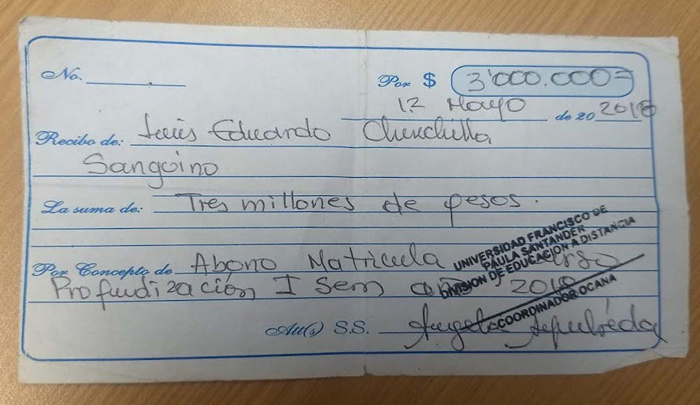 Mencionó que cada uno de los 60 estudiantes afectados pagaba cada semestre en efectivo el valor de la matrícula a la coordinadora del Cread Ocaña de la época, Ángela María Sepúlveda, y ella, a cambio, nos certificaba el pago con un recibo firmado y con sello de la universidad.