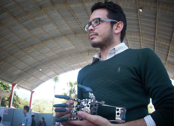 “La primera prótesis es la que más ha gustado, es pentadigital y funciona como una especie de pinza para sujetar objetos como lapiceros o tornillos. Es operada por el movimiento que ejercen los omoplatos y lo transmiten a la mano”.
