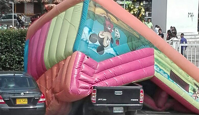 “De repente, empezó a dar vueltas y con el carro se atrancó el inflable, soltando a las niñas. En seguida se elevó varios metros y cayó en ese espacio del hotel”, afirmó Nubia Rubio, quien se movilizaba en el carro afectado.