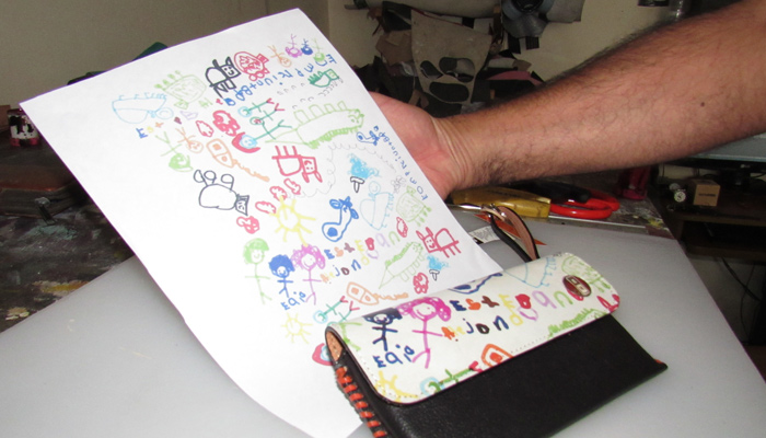 (Prototipo de cartera para mujer, estampado con dibujos infantiles. La meta es que los compradores faciliten los dibujos de sus hijos para generar diseños exclusivos.)