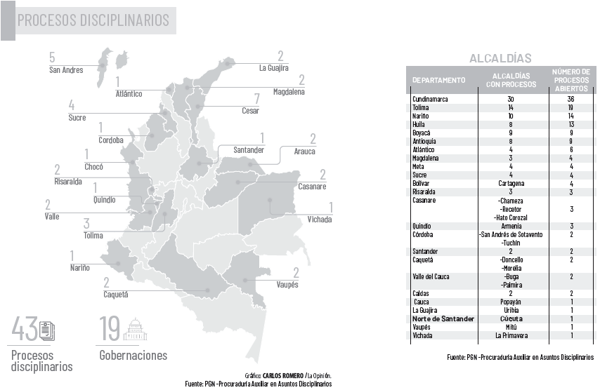 Como parte de ese seguimiento en las regiones, a la fecha, el ente de control ha abierto ya 43 procesos disciplinarios en 19 de las 32 gobernaciones del país.