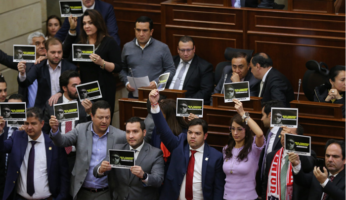 Al entrar, Santrich se ubicó atrás del recinto, en su silla y en ese momento la mayoría de los representantes se levantaron de las sillas y se fueron adelante a exponer los carteles que decían “en el Congreso no queremos terroristas”.
