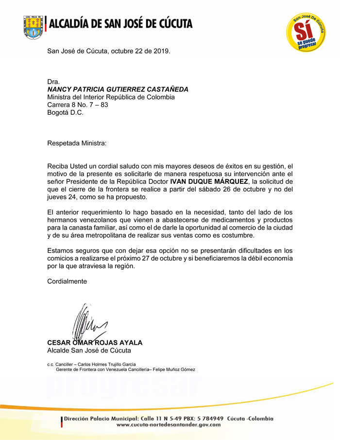 Sin embargo, este martes se conoció una solicitud de la Alcaldía de Cúcuta para que el cierre se hiciera desde el sábado y no desde el jueves, argumentando que la necesidad de los venezolanos de abastecerse de medicamentos y alimentos, así como beneficiar "la débil economía por la que atraviesa la región".