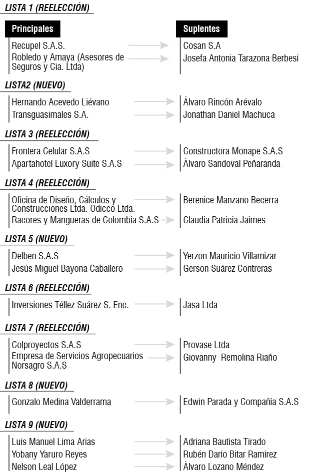 En esa carrera figuran Fernando del Corte, por el sector de las confecciones y la moda (lista 5); el empresario del sector agroindustrial, Luis Lima (lista 9); Francisco Javier Pabón, de Frontera Celular (lista 3); Omar Quintero, por el sector de las construcciones Odicco (lista 4) y el cuestionado empresario del transporte, Hernando Acevedo (lista 2), quien ya en el pasado hizo parte de la junta, pero fue reemplazado por su suplente.