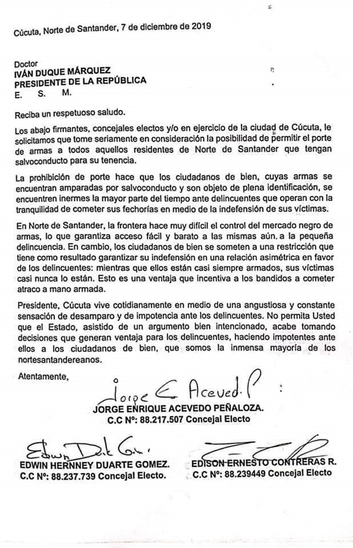 El concejal electo Jorge Acevedo, junto con los cabildantes electos Edwin Hernney Duarte Gómez y Edison Ernesto Contreras, firman una petición al presidente Iván Duque para que permita en Norte de Santander el porte de armas a quienes tengan salvoconducto para su tenencia.