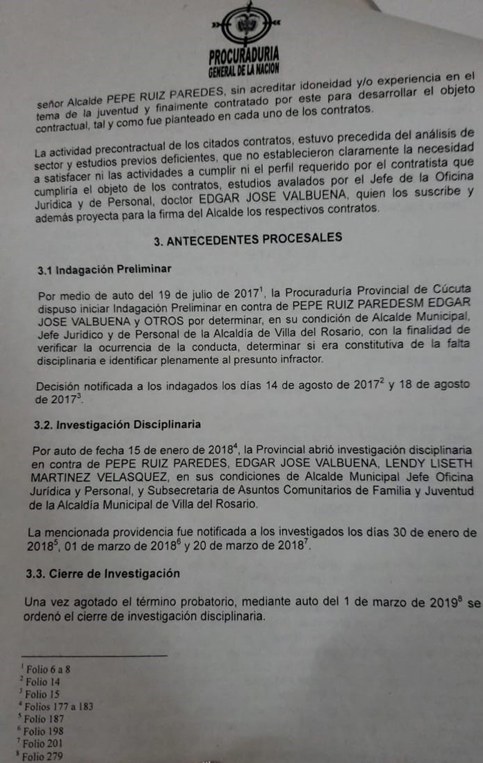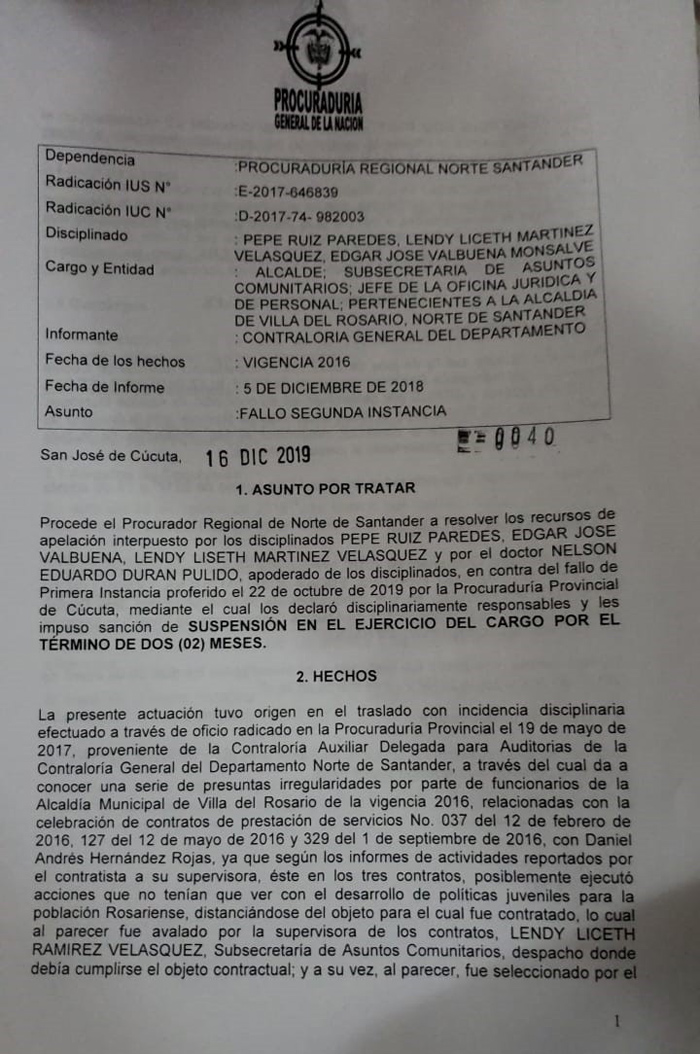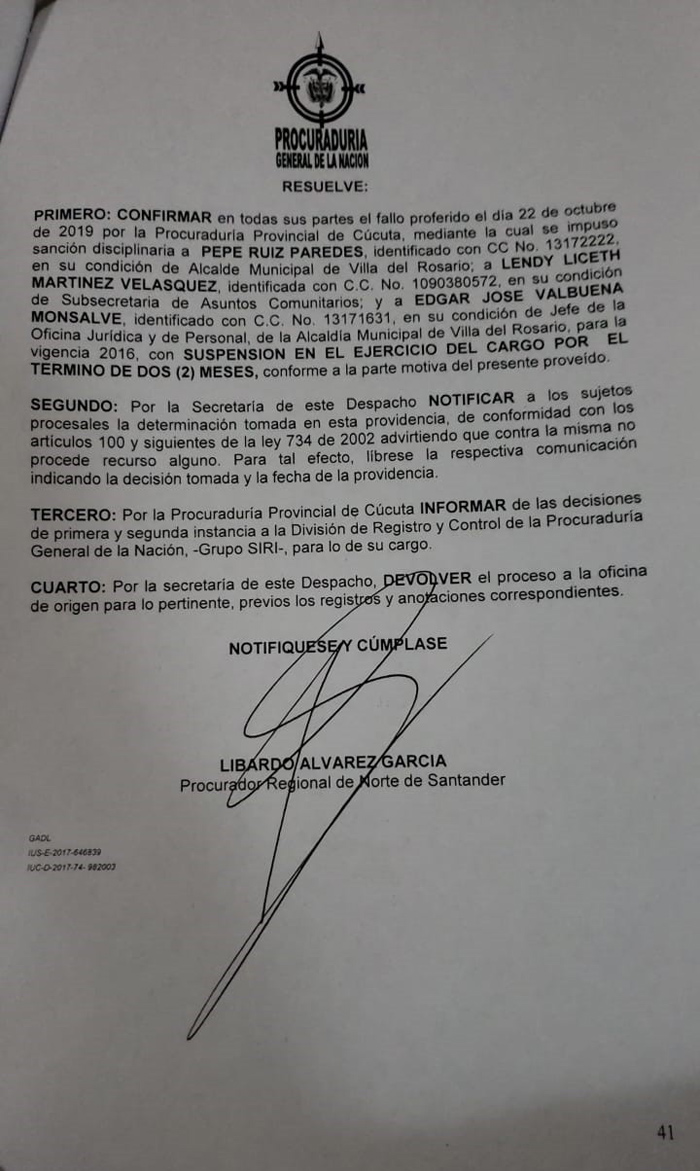 Tras su apelación, la Procuraduría Regional de Norte de Santander confirmó el fallo proferido el 22 de octubre por la Procuraduría Provincial de Cúcuta, por el cual fue suspendido dos meses de su cargo el alcalde de Villa del Rosario, Pepe Ruiz Paredes.