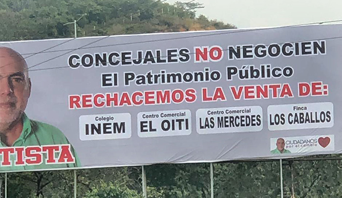 Hace unos días, el precandidato a la Alcaldía de Cúcuta por el movimiento Ciudadanos por el Cambio, José Fernando Bautista, instaló una valla en la glorieta García Herreros, en la que exhortaba a los concejales de la ciudad a no autorizar la venta de varios bienes inmuebles del municipio, tal y como lo solicitó el alcalde César Rojas.