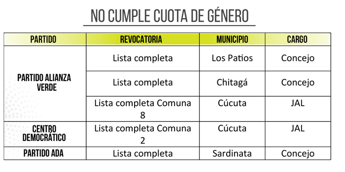Así las cosas, por ejemplo, la lista del ADA al Concejo de Sardinata estaba conformada por cuatro candidatos, de los cuales apenas una era mujer. La del Centro Democrático a la JAL de la Comuna 2 estaba integrada por 2 hombres y cero mujeres; la de la Alianza Verde al Concejo de Los Patios, tenía 4 mujeres y 6 hombres.