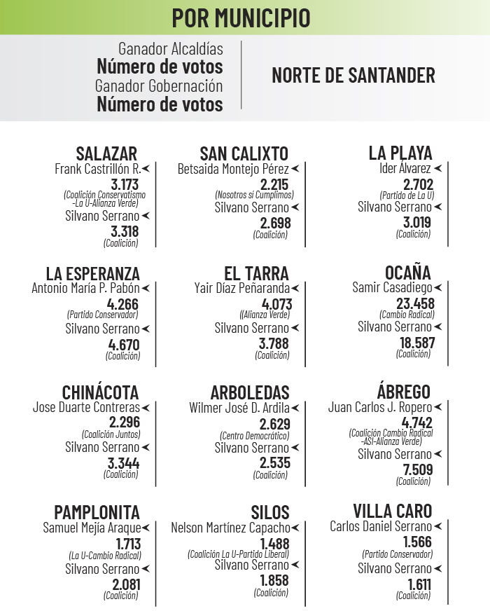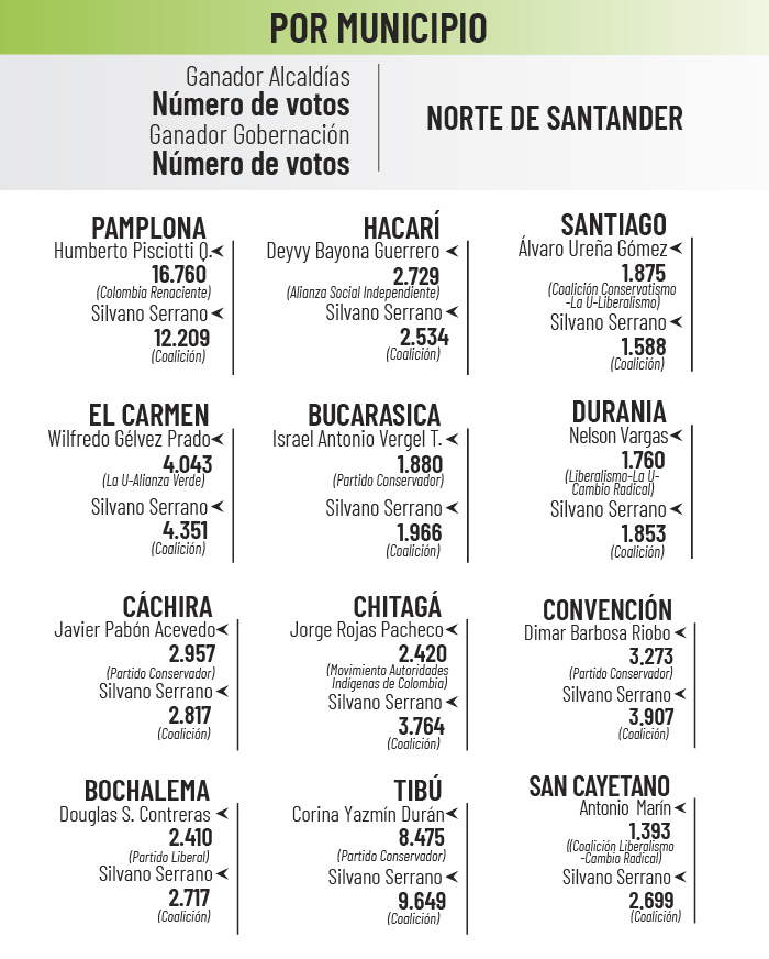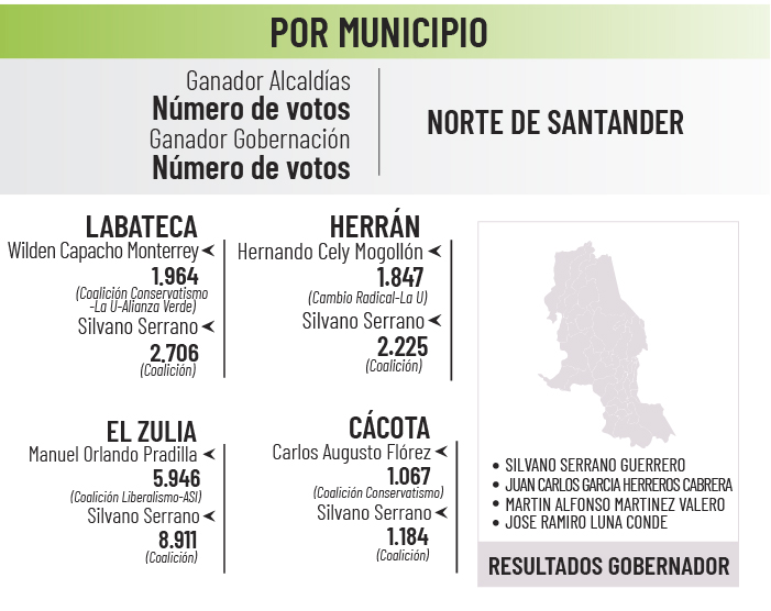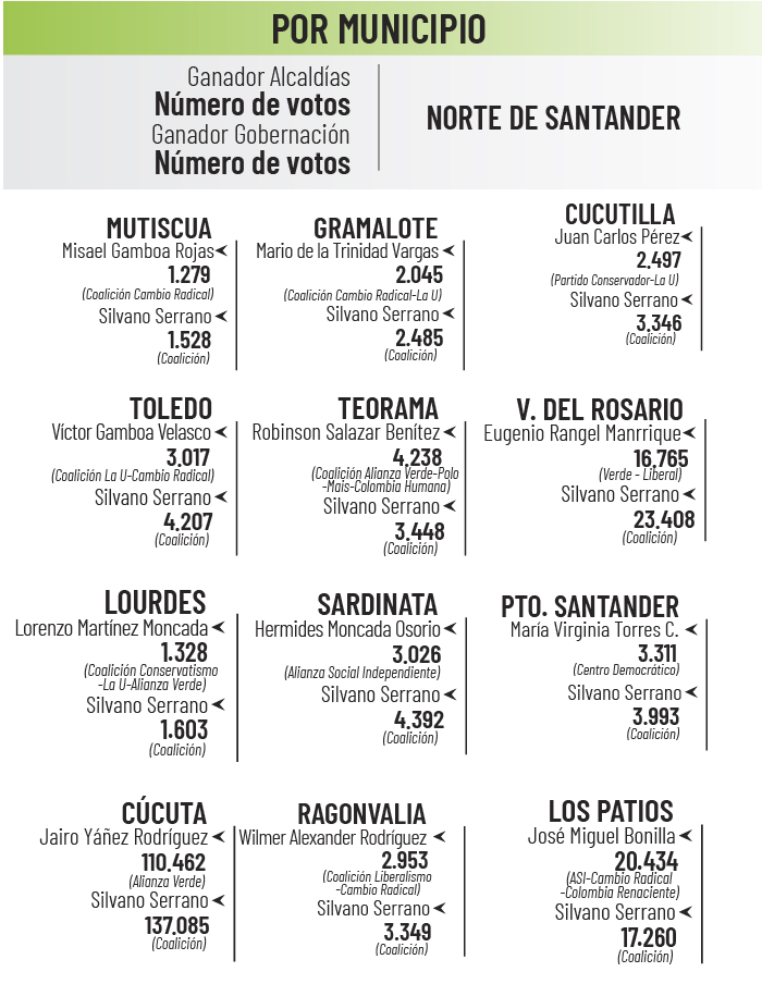 Frente a hace cuatro años, debe destacarse el fenómeno de que ninguno de los contendientes de Silvano Serrano que por 326.202 votos ganó las elecciones a la Gobernación de Norte de Santander, se le impusieron en ninguno de los 40 municipios.