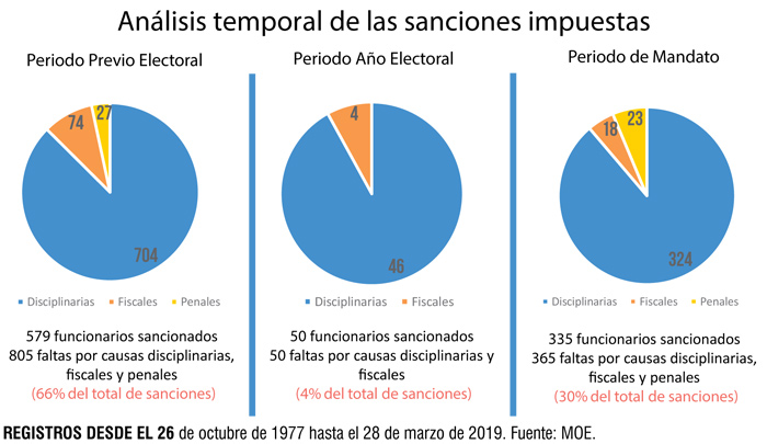 La MOE aseguró que desde 1979 ha habido 579 funcionarios sancionados por 805 causas disciplinarias o fiscales antes del periodo electoral, 50 sancionados por 50 causas disciplinarias o fiscales durante el año electoral y 335 funcionarios sancionados por 365 faltas disciplinarias o fiscales durante el periodo de mandato. (Ver gráficas)