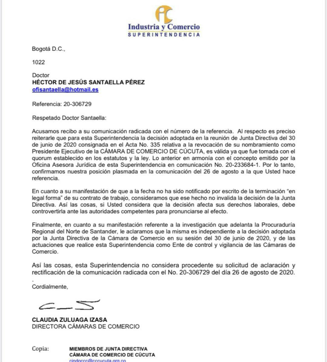 En respuesta a una petición que el directivo había elevado pidiendo claridad frente a su caso, la Super le manifestó que aun cuando no haya sido notificado por escrito de la terminación en forma legal de su contrato de trabajo, “consideramos que ese hecho no invalida la decisión de la junta directiva”.