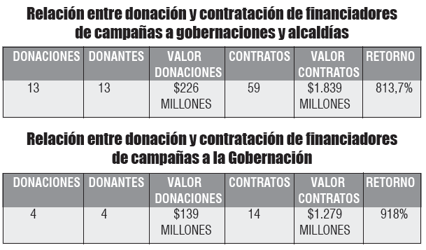 Según los resultados de este análisis, en la pasada contienda local, 485 donantes hicieron 534 aportes a campañas políticas por un monto de $4,4 mil millones. Entre estas 485 personas recibieron 2.410 contratos de parte de las administraciones, por un monto de $169.000 millones. El valor de los contratos adjudicados equivale a 39 veces el valor donado en campaña.