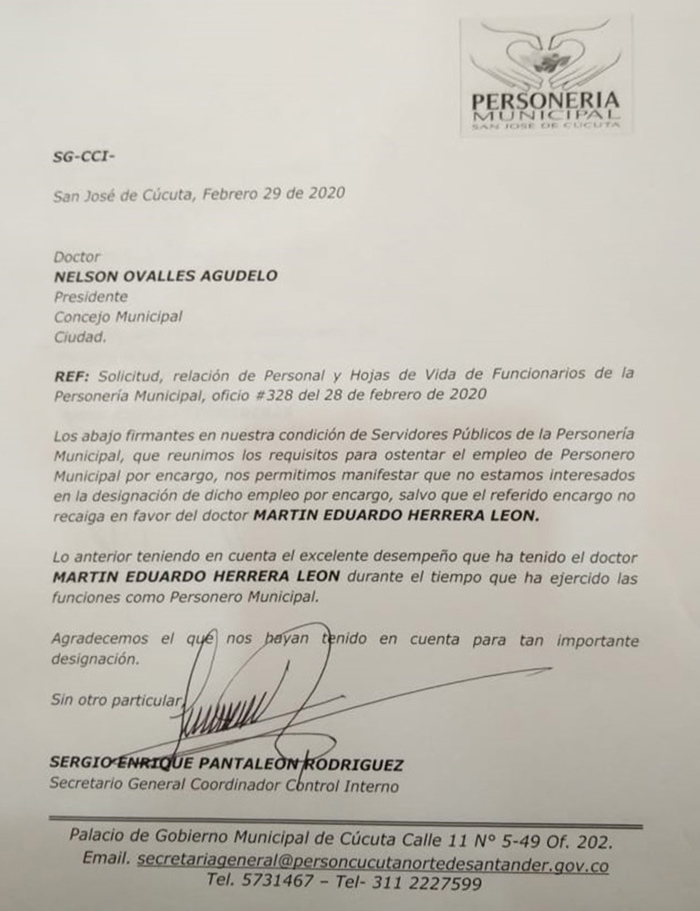 “Lo anterior, teniendo en cuenta el excelente desempeño que ha tenido el doctor Martín Eduardo Herrera León durante el tiempo que ha ejercido las funciones como personero municipal”, manifestaron los funcionarios. (Ver facsímiles).