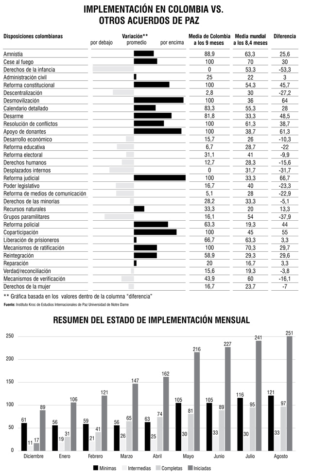Destacan, igualmente, el progreso que ha tenido la implementación mes a mes. Según el seguimiento hecho al proceso, en diciembre de 2016 el porcentaje de disposiciones contenidas en el acuerdo que se empezaron a poner en marcha llegaba a 16, y en agosto pasado esa cifra aumentó al 45%.