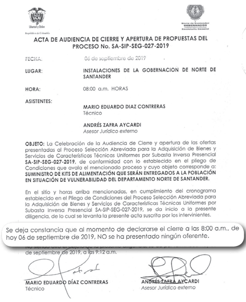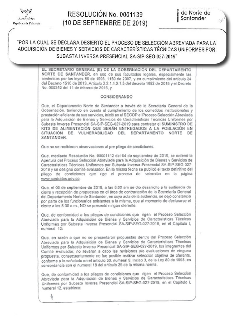 Para la vigencia 2019, los pliegos del proceso contractual fueron publicados el 8 de agosto bajo el número SA-SIP-SEG-027-2019, en el portal del Secop y tenían como finalidad “el suministro de kits de alimentación que serán entregados a la población en situación de vulnerabilidad de Norte de Santander”.