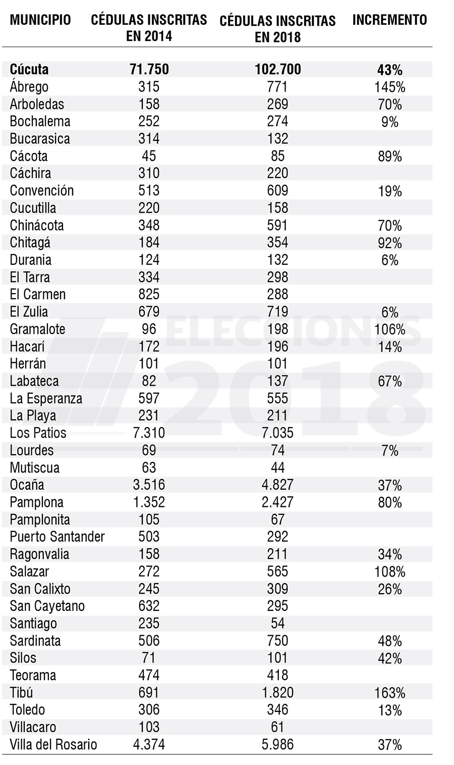 Según el reporte de la organización electoral, los municipios del departamento en los que más incrementó la inscripción de documentos, bien sea porque los potenciales votantes cambiaron de residencia, porque decidieron votar por primera vez o, como en el caso de los reinsertados de las Farc, porque recuperaron sus derechos políticos, fueron: Tibú (163%), Ábrego (145%) Salazar de las Palmas (108%) y Gramalote (106%).