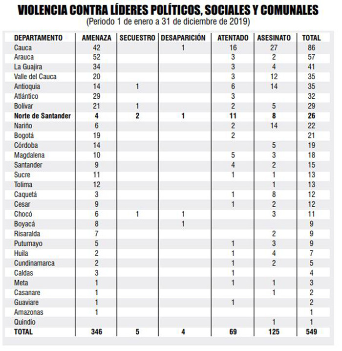 “Durante el 2019, en promedio cada tres días un líder fue asesinado en Colombia, mientras que cada día un líder era víctima de violencia política. Las agresiones se presentaron en 205 municipios (20% del total nacional) en 29 departamentos (87,8%). Los únicos departamentos en donde no se registraron víctimas a nivel departamental fueron Guainía, Vichada y Vaupés”, señala un aparte del informe.