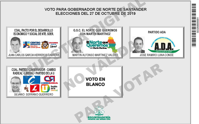 En el caso de la Gobernación de Norte de Santander son cuatro los candidatos que aparecerán ubicados en el siguiente orden: Juan Carlos García-Herreros (Centro Democrático y Colombia Justa Libres), Martín Martínez (El Norte que queremos), José Ramiro Luna Conde (Alianza Democrática Afrocolombiana) y Silvano Serrano Guerrero (Partido Conservador, Cambio Radical, la U y el liberalismo).