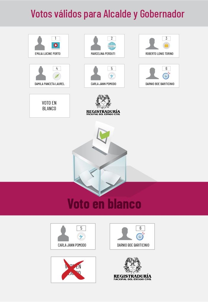 Cargos uninominales: Alcalde y Gobernador, como existe solamente un candidato por colectividad, los ciudadanos deben elegir alguno de los aspirantes que aparecen con foto en la tarjeta electoral.