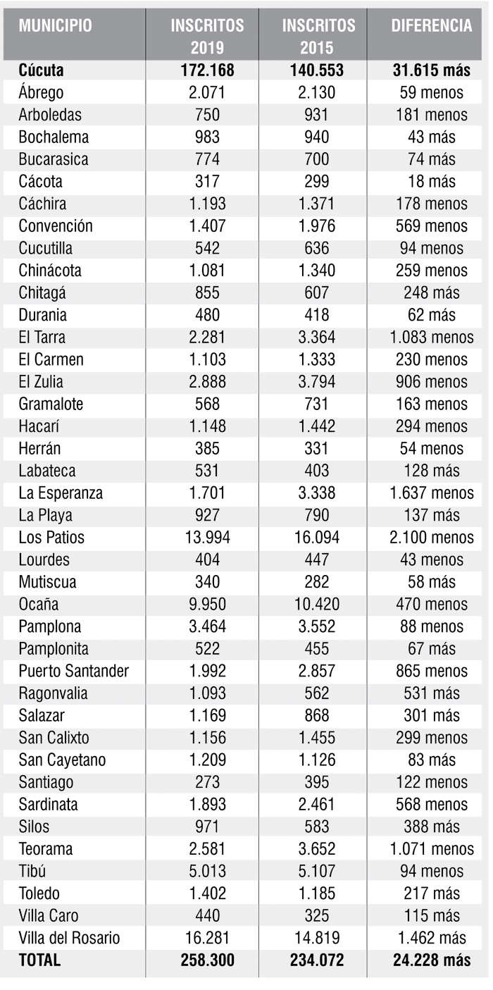Como en cada elección, el aumento más significativo en la inscripción de cédulas se dio en Cúcuta, en donde de 140.553 inscritos que se presentaron para las elecciones de 2015, este año se pasó a 172.168.
