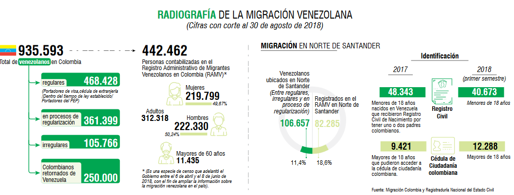 Por su parte, la Registraduría Nacional informó que durante 2017, 9.421 ciudadanos venezolanos con padre o madre colombiana, mayores de 18 años,  se acercaron a una de las sedes de la entidad a tramitar su cédula de ciudadanía. En el primer semestre de este año lo hicieron otros 12.288, para un total de 21.709 nuevos ciudadanos colombianos a la fecha.