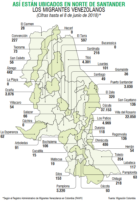 Las regiones con mayor presencia de venezolanos en Colombia son Bogotá (23,5%), La Guajira (11,7%) y Norte de Santander (11,4%). En esta última región, las cifras de Migración señalan que hay 106.657 personas provenientes de Venezuela repartidas en 36 de sus 40 municipios. De ellas, 82.285 están debidamente registradas en el reciente censo del Gobierno Nacional.