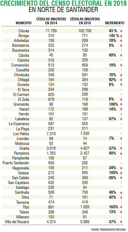 Hay otros casos inquietantes en el departamento. El de Ábrego, municipio de la convulsionada subregión del Catatumbo, es uno de ellos. Allí han llegado a residir 442 personas provenientes del vecino país. Al cierre del proceso de inscripción de cédulas del año pasado, esta fue una de las localidades del país que más llamó la atención por el elevado aumento del Censo Electoral, pues pasó de 315 cédulas registradas hace cuatro años, a 771. Eso quiere decir 145% más.