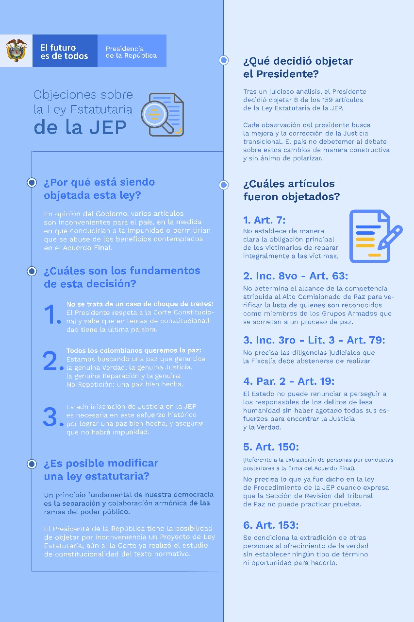 En alocución televisada, Duque destacó que objetará 6 de los 159 artículos de la ley estatutaria de la Jurisdicción Especial para la Paz (JEP) por considerarlos inconvenientes. "He decidido realizar objeciones a seis de los 159 artículos de la Ley Estatutaria de la Jurisdicción Especial para la Paz por razones de inconveniencia e invitar a que el Congreso de la República las debata constructivamente”, indicó Duque.