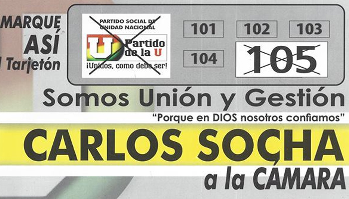 Candidato a la Cámara por la U. Lema: ‘Somos unión y gestión. Porque en Dios nosotros confiamos’.