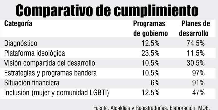 Al resultado comparado de los programas de gobierno y de los planes de desarrollo les asignaron un porcentaje y la conclusión fue que las propuestas iniciales no estaban estructuradas y carecían de información detallada. Pese a ello, los planes de desarrollo suplieron, en parte, esa carencia de información.
