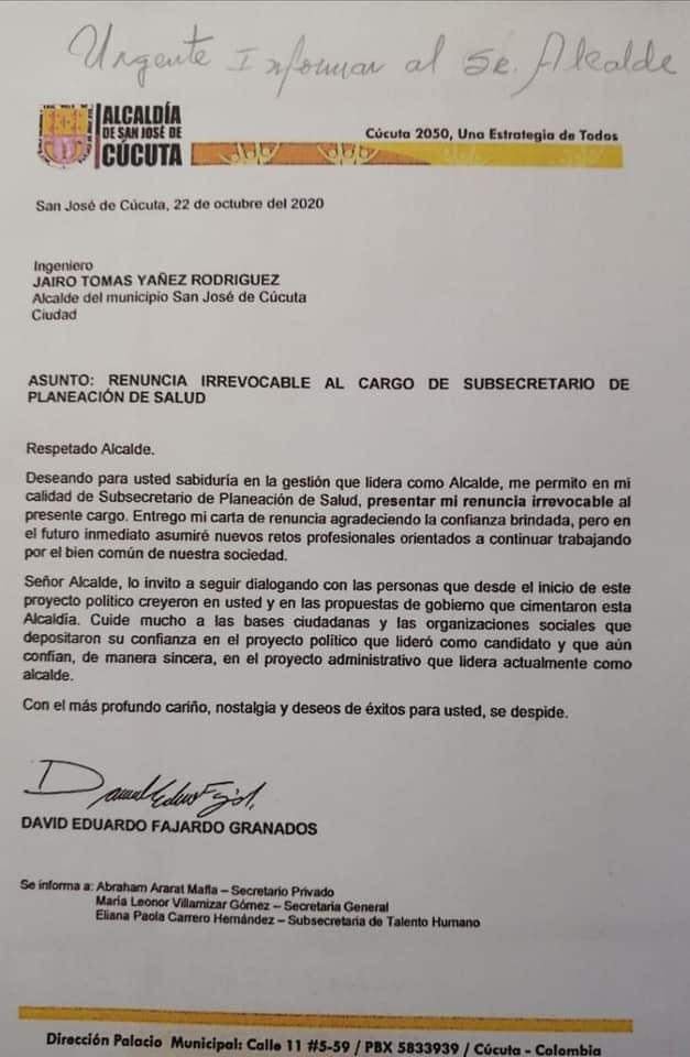 Por medio de una escueta carta en la que argumenta "nuevos retos personales y profesionales", el subsecretario de salud de Cúcuta, David Eduardo Fajardo Granados, presentó su renuncia irrevocable al cargo.