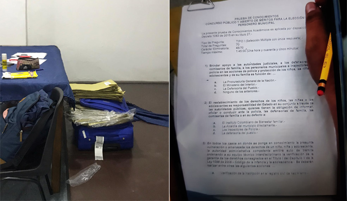 (Los paquetes en los que estaban las pruebas de conocimientos que se iban a aplicar, según los candidatos a personeros, no presentaban mayores garantías de seguridad. Ante la falta de vigilancia en los salones, las fotos de la prueba empezaron a rodar por los teléfonos.)