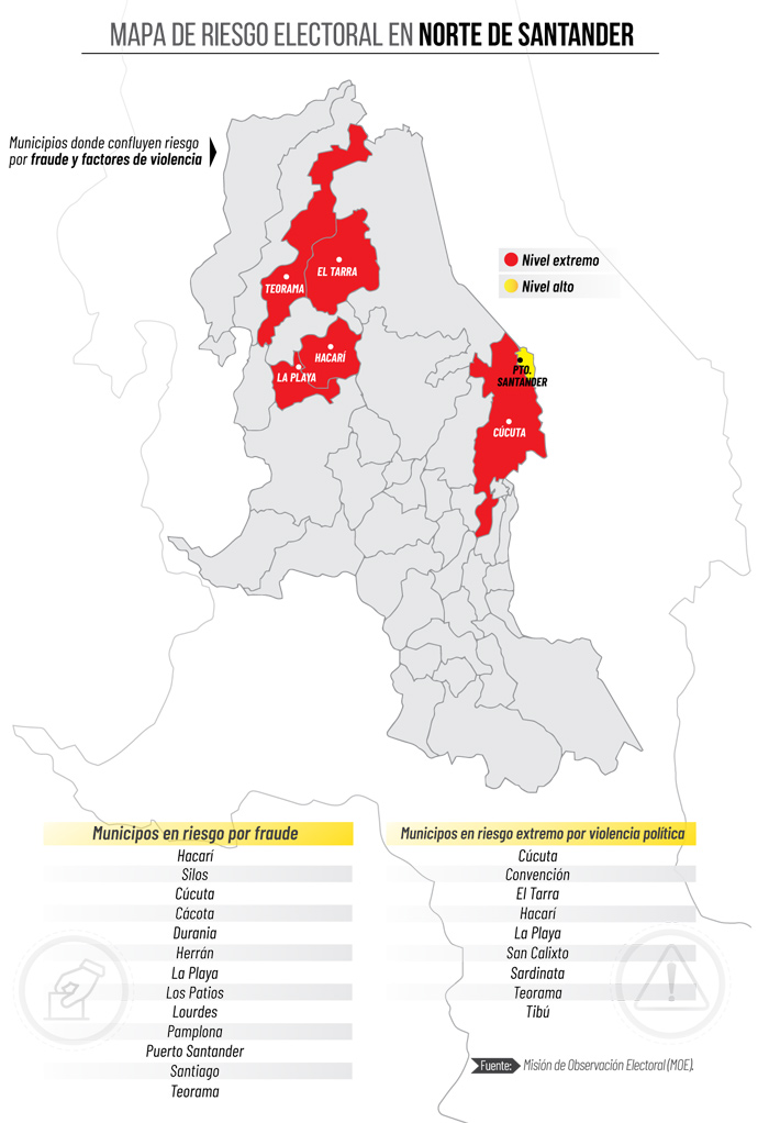 En Norte de Santander hay seis municipios donde la Misión de Observación Electoral (MOE) detectó un escenario de riesgo extremo y alto para la celebración de los comicios del próximo 27 de octubre.