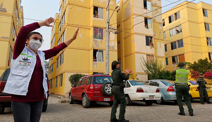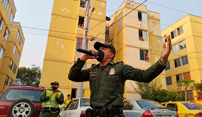 Los policías llevaron un rato de recreación, enviaron mensajes de prevención y realizaron aspersión de andenes y fachadas de las casas