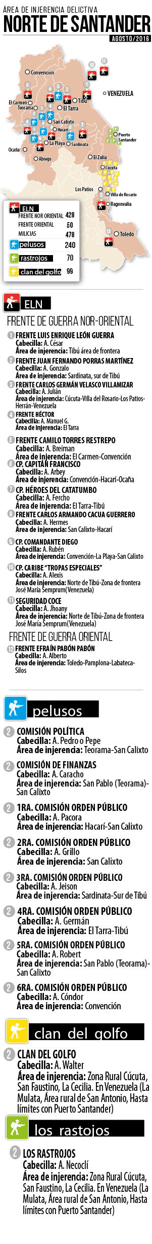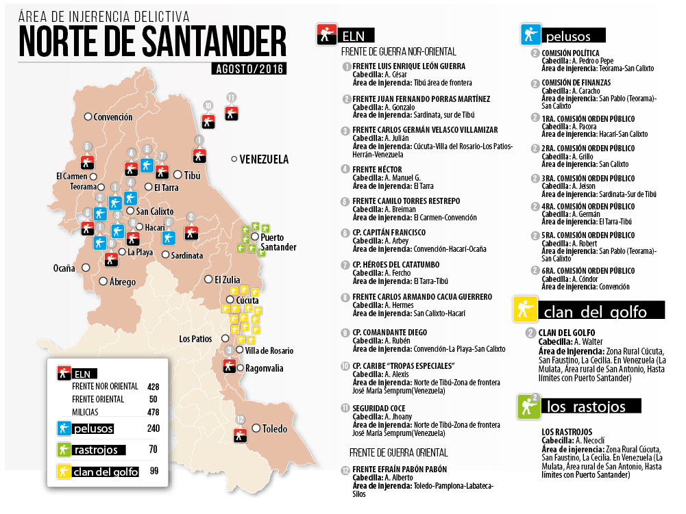 En este mapa se puede apreciar claramente,  qué grupos armados ilegales se encuentran en Norte de Santander y cuáles son las zonas dónde delinquen. En algunos puntos se ve que hay una clara complicidad entre ellos, al parecer, resultado de los nexos con el narcotráfico.