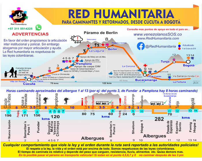 Debido a esta situación, un grupo de 300 voluntarios se juntó desde hace dos años para crear la red humanitaria que atiende a caminantes venezolanos en Cúcuta, Pamplona y Bucaramanga. Los migrantes encuentran en su camino 14 albergues donde les brindan alimentación y hospedaje temporal.