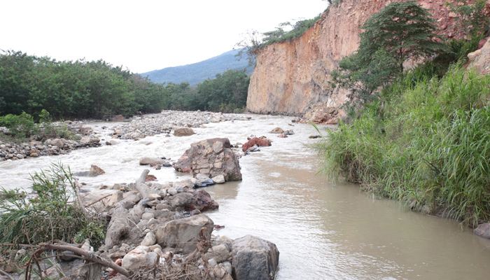 (En este tramo del río Táchira fue donde se presentó el jueves en la madrugada la destrucción del dique de la bocatoma, producto del deslizamiento de piedras y tierra del cerro que se observa a la derecha.)